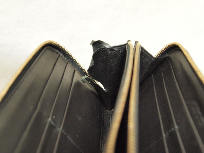 ボッテガべネタの長財布です。マチ革がやぶれています。