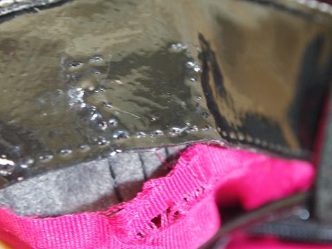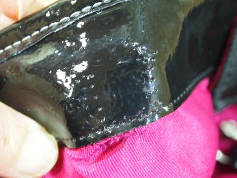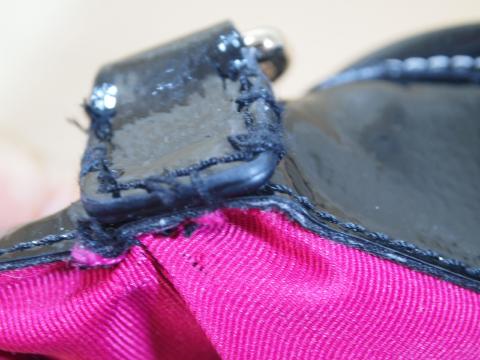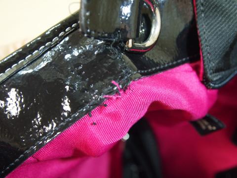 ピンクの内布にもダメージを与えて損傷を悪化させています。