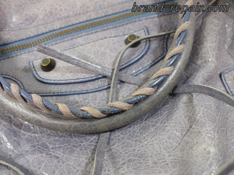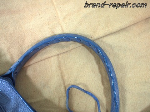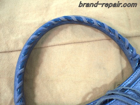 紐が巻かれたシティの持ち手ですがコバ面にひび割れ劣化が見られます。
