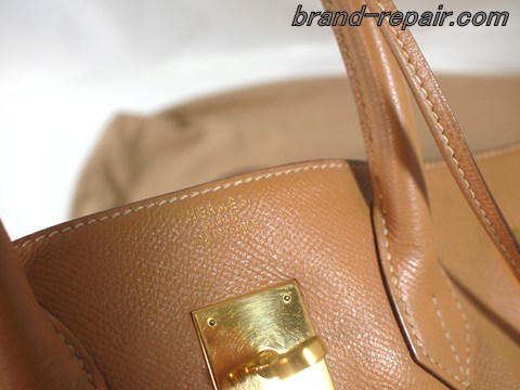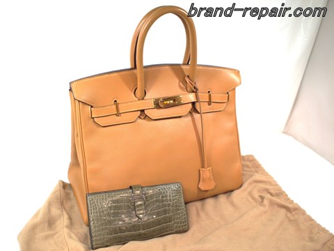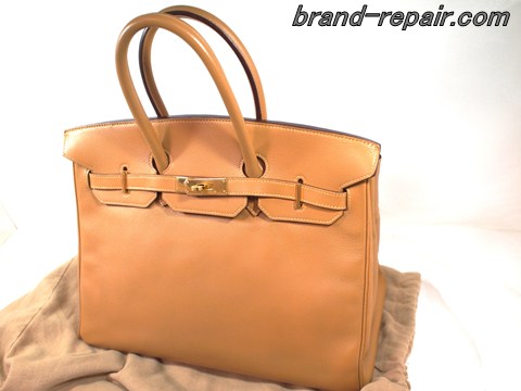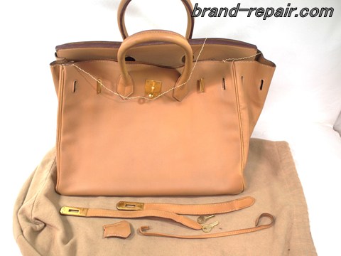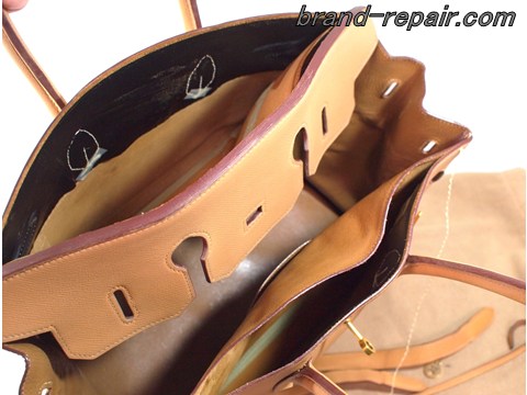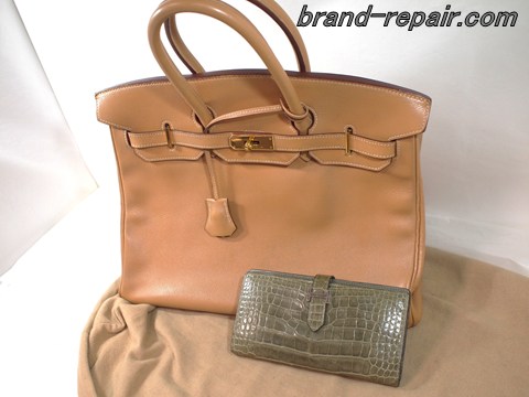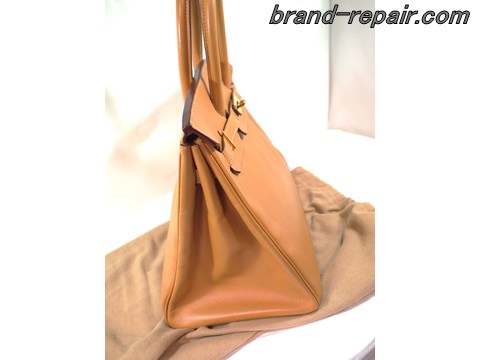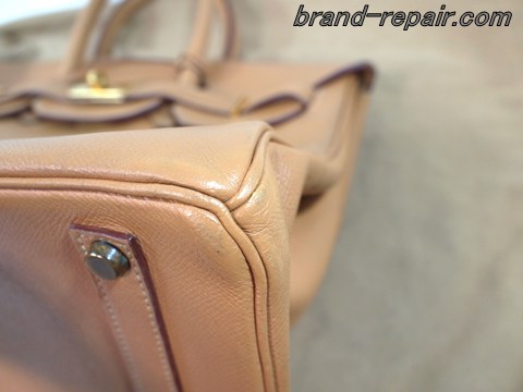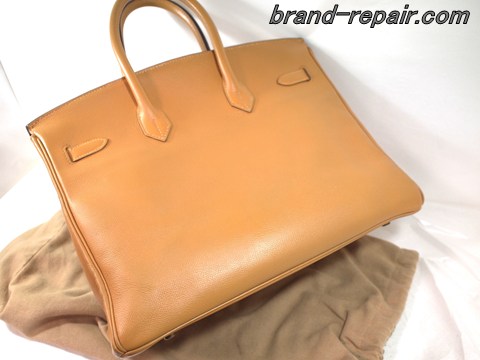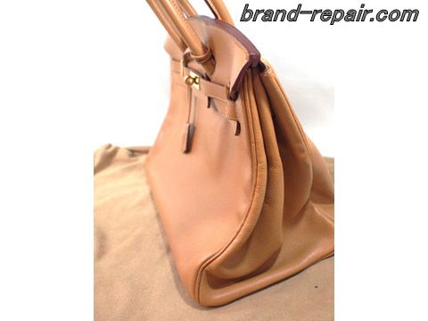 バーキンは前後面に強化芯材を入れこみ補修補色加工とヒネリ金具の再生。