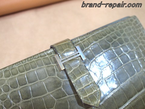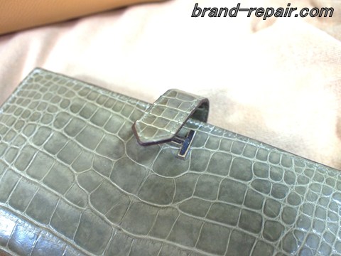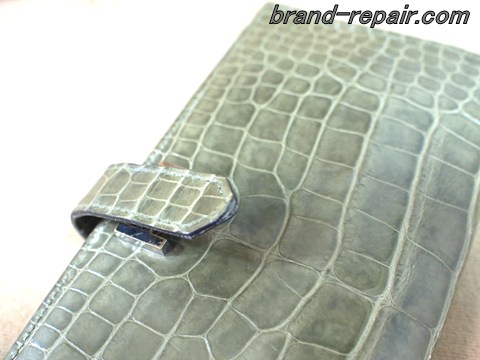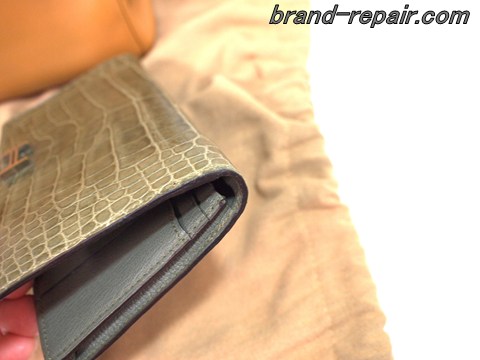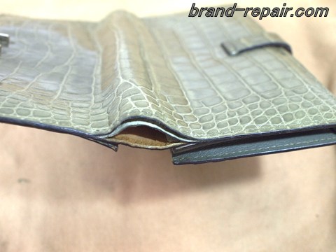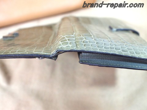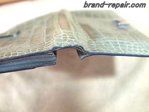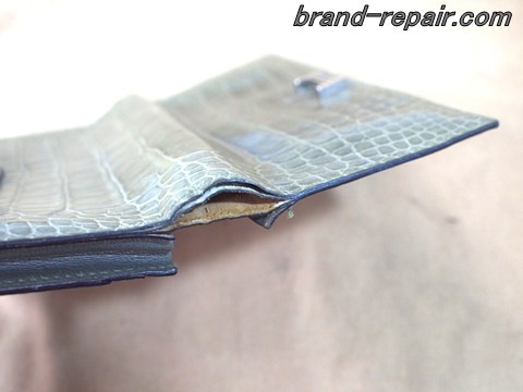 クロコ革ベアンもほつれて口が空いていた折り曲げ部の強化加工は、