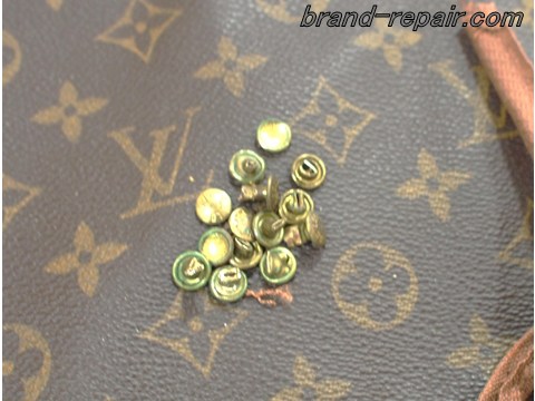 刻印入りカシメ金具やD型金具も変色して革は劣化しています。